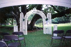 Diamond Pattern White Lattice Wedding Arch 90" wide, 14" deep, 95" high Oval Top Lattice Left and Right Side Panels 20" wide, 84" high Matching Pair of Hard Table Top Flower Stands (Also called Aisle Posts) 12" x 12" top, 36' high Complete ensemble: Call for Price |
